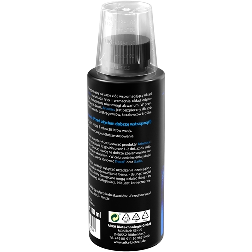 Microbe-lift Artemiss - w 100% naturalna kuracja wzmacniająca system odpornościowy ryb działająca przeciwko bakteriom. Unikalny i opatentowany preparat oparty na naturalnych ziołach będących podstawą jego składu. Środek w przeciwieństwie do zwykłych produktów innych firm nie niszczy pożytecznych bakterii oraz nie destabilizuje środowiska w akwarium. Po jego zastosowaniu nie ma potrzeby przeprowadzania podmian wody i filtrowania jej przez węgiel aktywny.